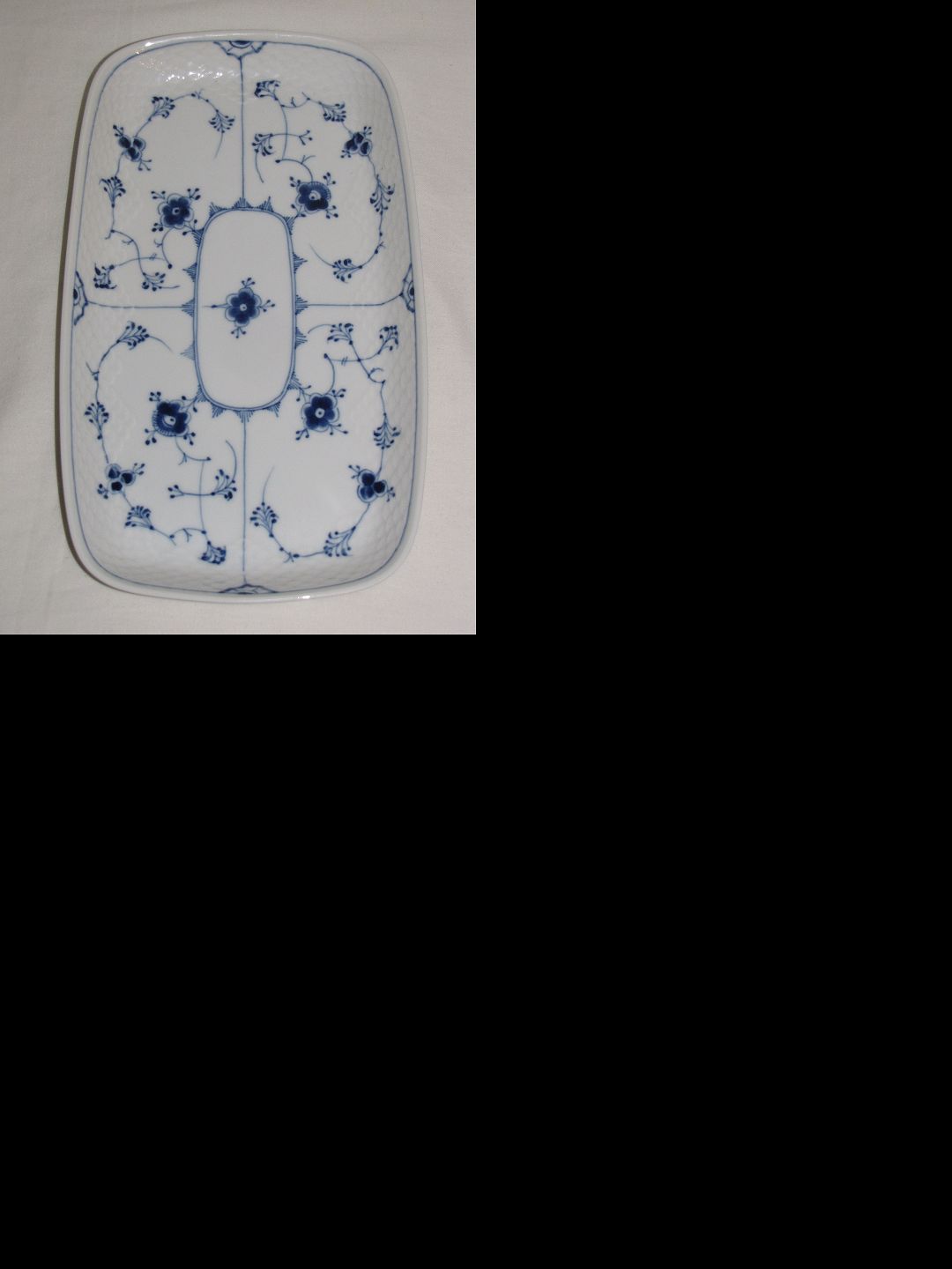 Beskrivelse: Blå Malet / musselmalet aflangt fad fra Bing & Grøndahl. Nummer 96. 28 cm. x 16 cm. 1. sortering