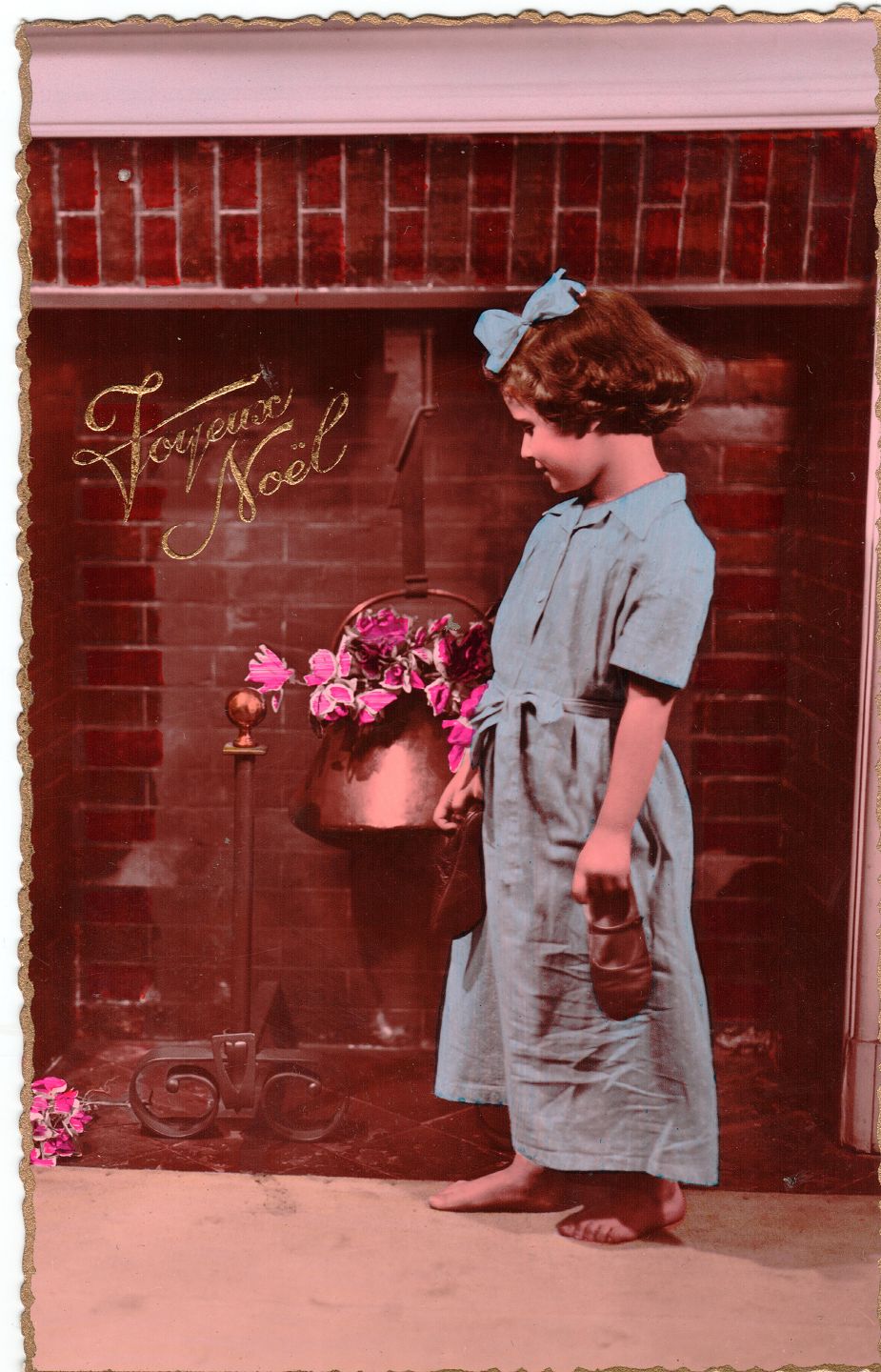 Beskrivelse: Fransk julekort 1940'erne. Lille pige i blå kjole ved kamin. Mål ca. 14 x 9 cm. Fremstår uden skrift.