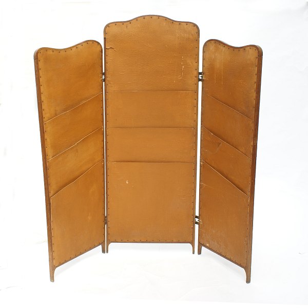 Beskrivelse: Tre fløjet paravent. Egetræsrammer inden for hvilke tre motiver i læder, delvist i relief.