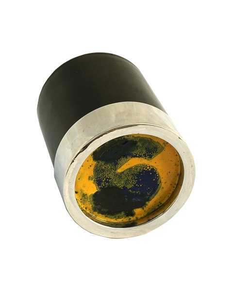 Beskrivelse: Lågkrukke, keramik med emaljearbejde på sølvlåg. Sterling
