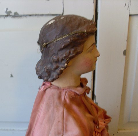 Beskrivelse: Smuk gammel fransk helgenfigur, hovedet er af bemalet gips. figuren er klædt i en dragt af silke.