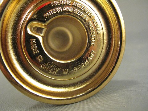 Beskrivelse: Freddie Andersen design clear drops, petroleum lampe/olielampe. lavet i messing og glas. mærket i bunden Freddie Andersen design, pattern and design protected, made in w. -germany. god stand og måler 48 cm høj