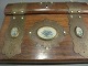 Beskrivelse: Antik / gammelt skrivesæt. antikt rejseskrivesæt i træ med flotte detaljer. messing beslag og små ruder med blomster. grønt stof inden i, blækhus og "guld" støv er der stadig, nøglen høre med. god stand. ingen skader.