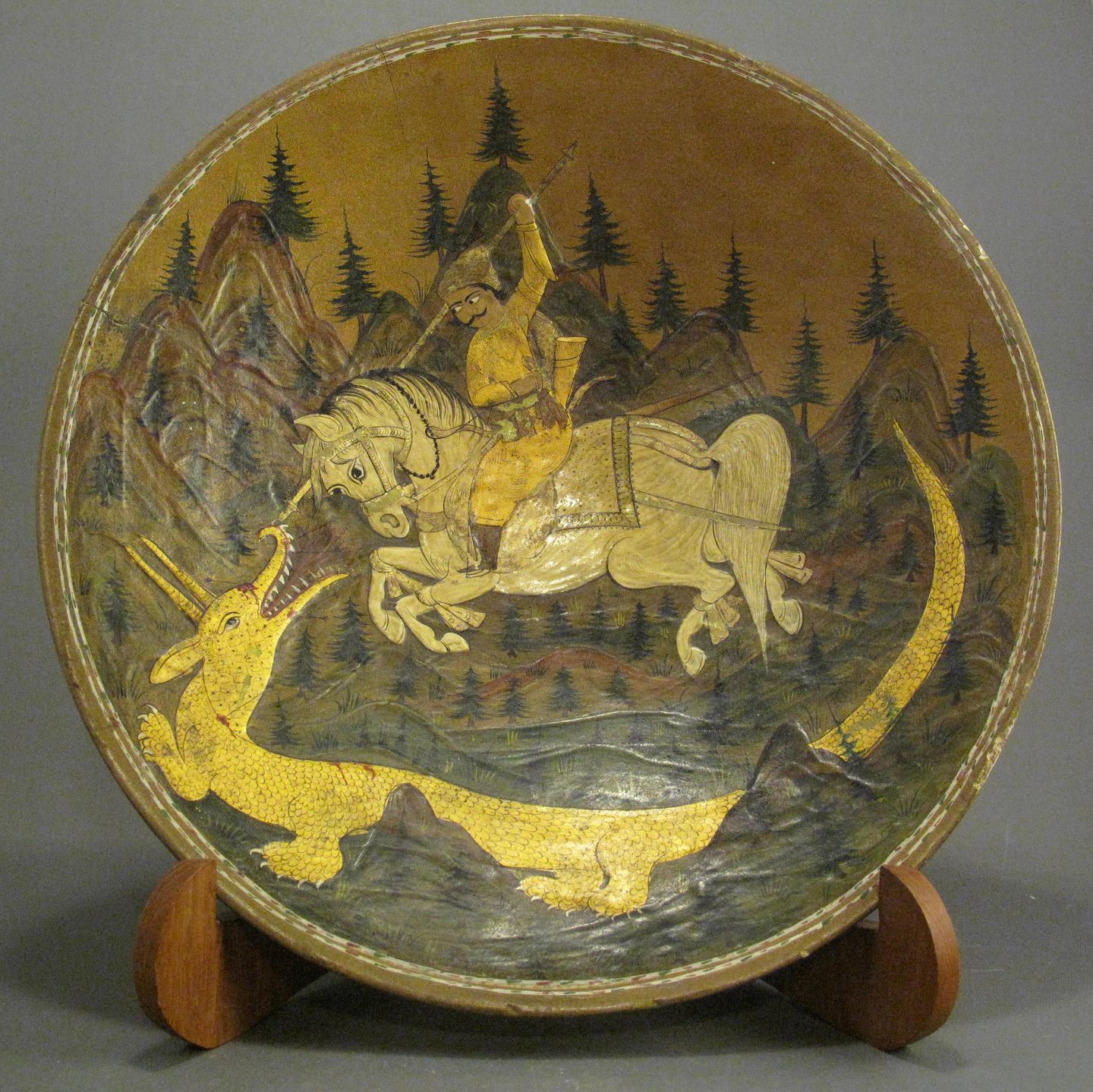 Beskrivelse: asiatisk papmache skål. motiv af en mand på hest der slås med en drage. kommer med aldersrelateret slitage. måler 33x8 cm