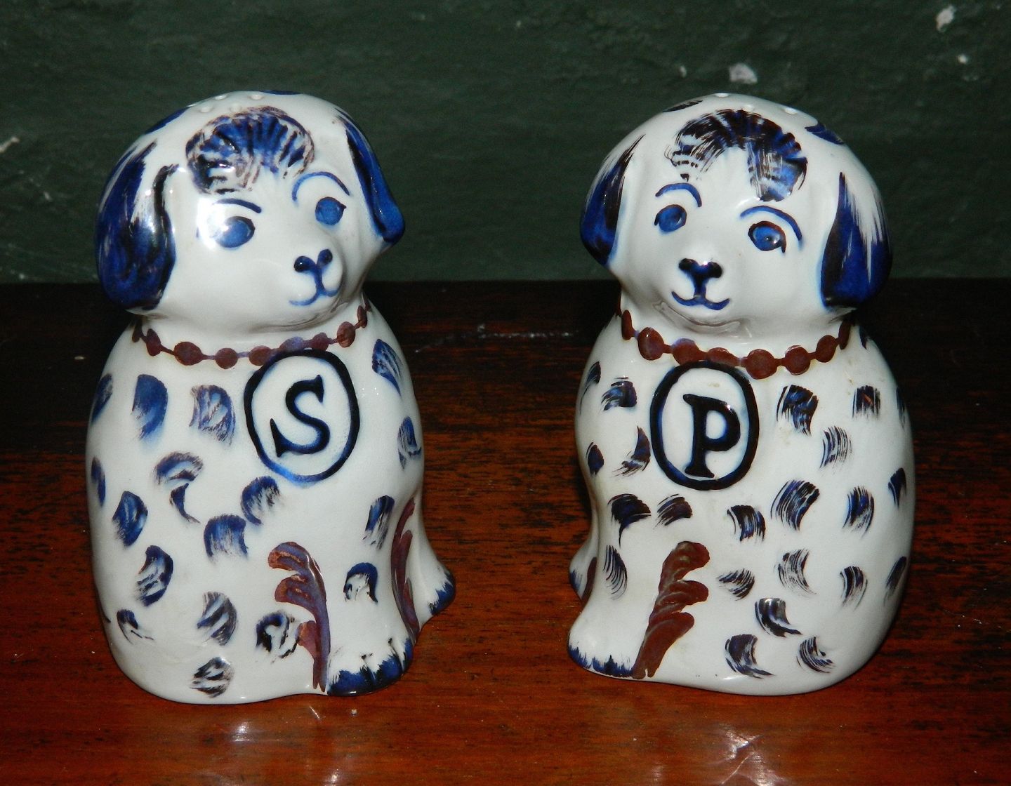 Description: Staffordshire dogs: Salt -and pepper set in faience by Royal Copenhagen. Designed by Doreen Middelboe. In perfect condition. Factory first production. Factory mark on the bottom together with the artist signature. 10 cm