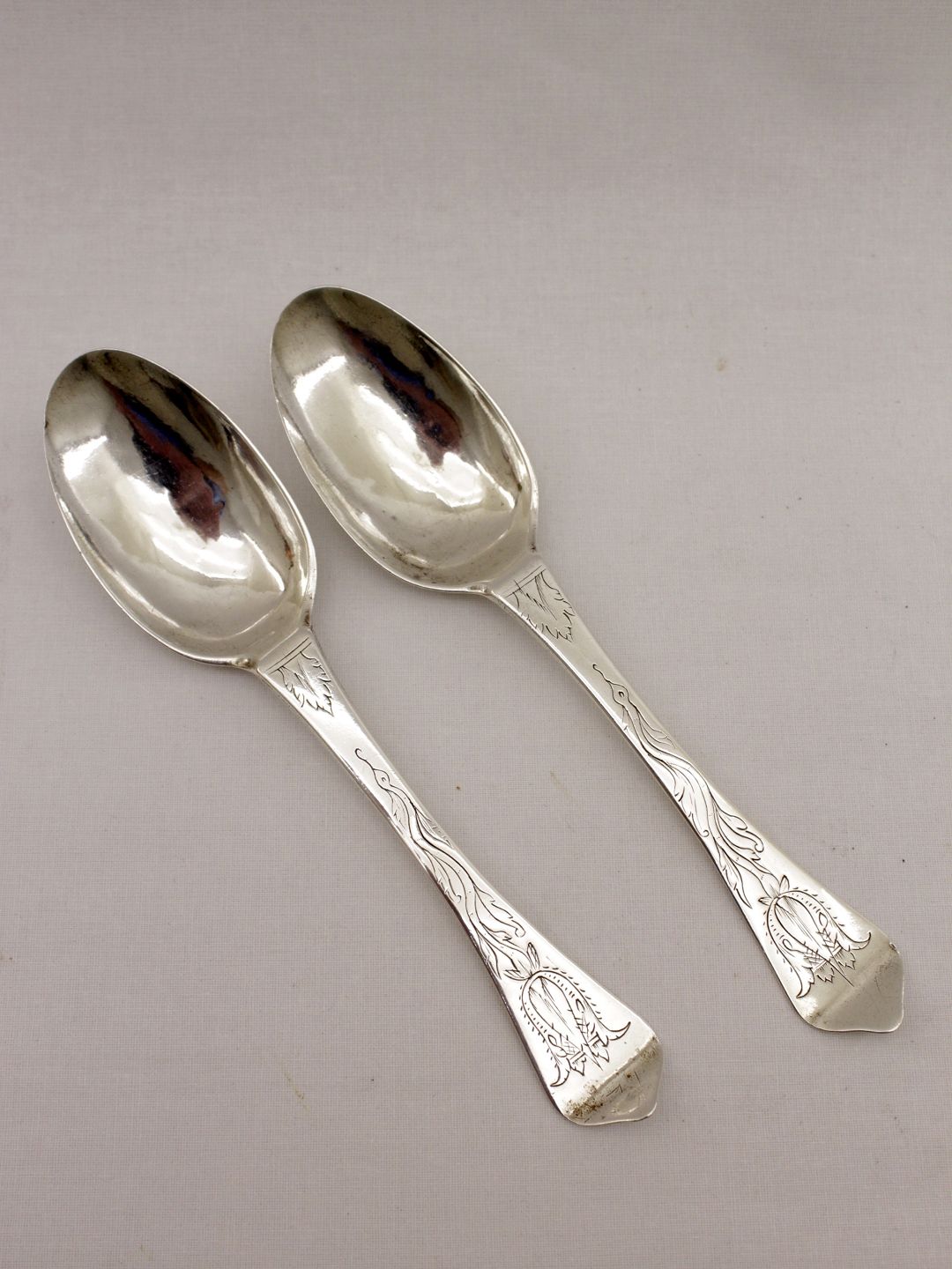 Beskrivelse: Sølvsmed Christian Vilhelm Schlegel Fredericia to skeer graveret " Tre Brødre 1744" og " Tre Søstre 1744" L. 19,5 cm. Nr. 274936