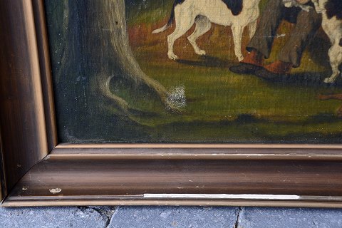 Beskrivelse: Maling på lærred med jagtmotiv. Utydelige signatur. Fremstår med brugsspor på rammen og krakeleringer mv. på maleriet (se foto).