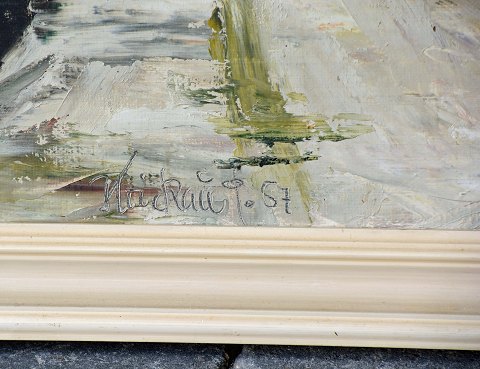 Beskrivelse: Maleri på lærred med motiv af skibe i havn. Maleriet er fra 1957 og signeret af Kai Rau. 1891-1957