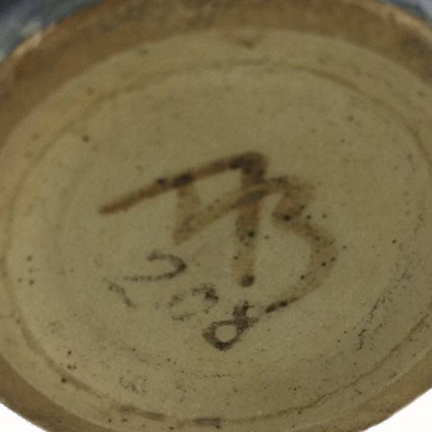 Beskrivelse: Arne Bang vase af stentøj modelleret med bølget kant. Dekoreret i mørk blå glasur med lysere elementer. Sign. monogram AB 208. Arne Bang, f. Frederiksberg 1901, d. Fensmark 1983. H. 12 cm.
