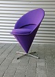 Beskrivelse: Mørklilla Cone chair designet af Verner Panton. Stolen her er den helt gamle model, med fjedre i pude. Fint stofbetræk og minimale brugsspor på stolens fod.