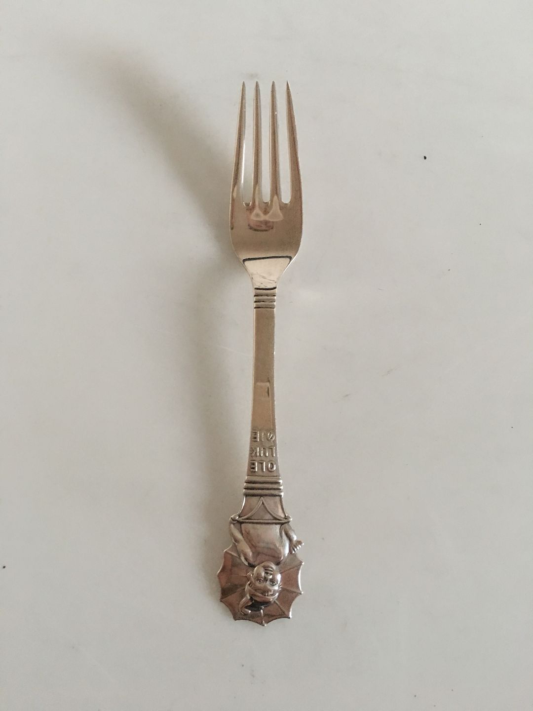Beskrivelse: Barnegaffel i Sølv med Ole Lukøje. Cohr, Horsens, Fredericia