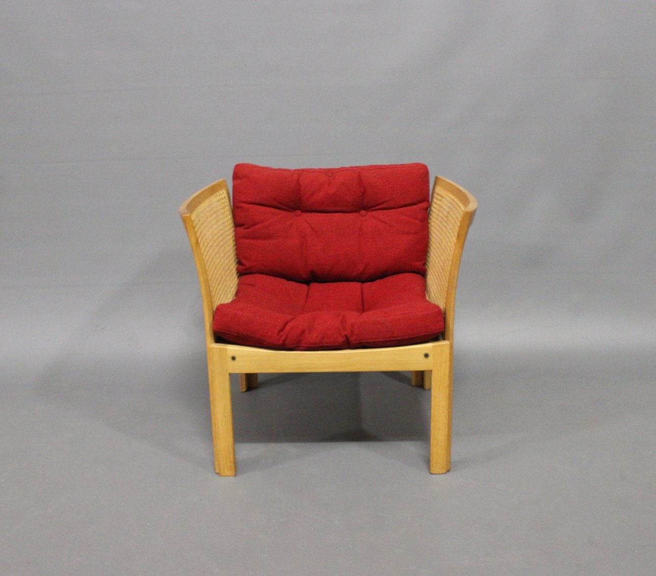 Description: A pair of easy chairs in oak designed by Rud Thygesen and Johnny Sørensen, manufactured by Silkeborg furniture factory in the 1960s.