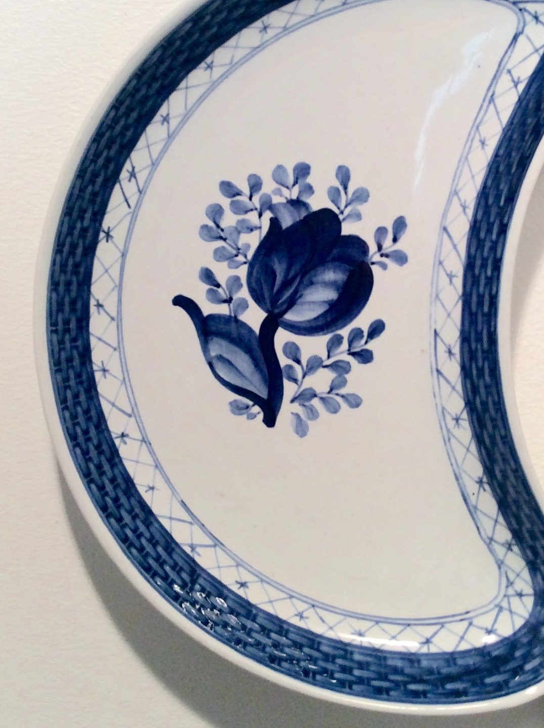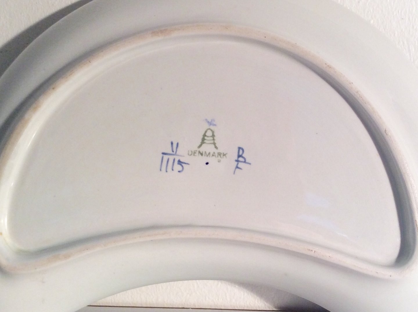 Description: Royal Copenhagen, Aluminia, Trankebar, Moon-shaped dish # 11/1115, 22.5cm wide, 1.Sorting, Design Christian Joachim *With cracks and some discoloration under the glaze*