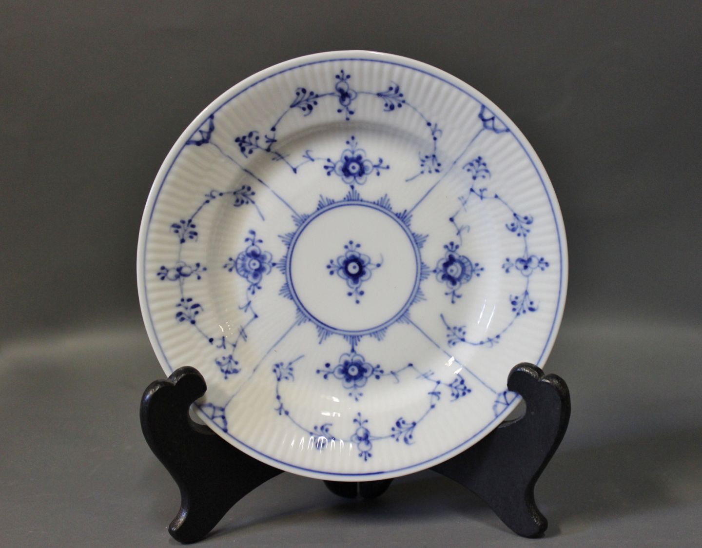 Beskrivelse: Kgl. Musselmalet riflet kagetallerkener #181. Spørg for antal på lager.