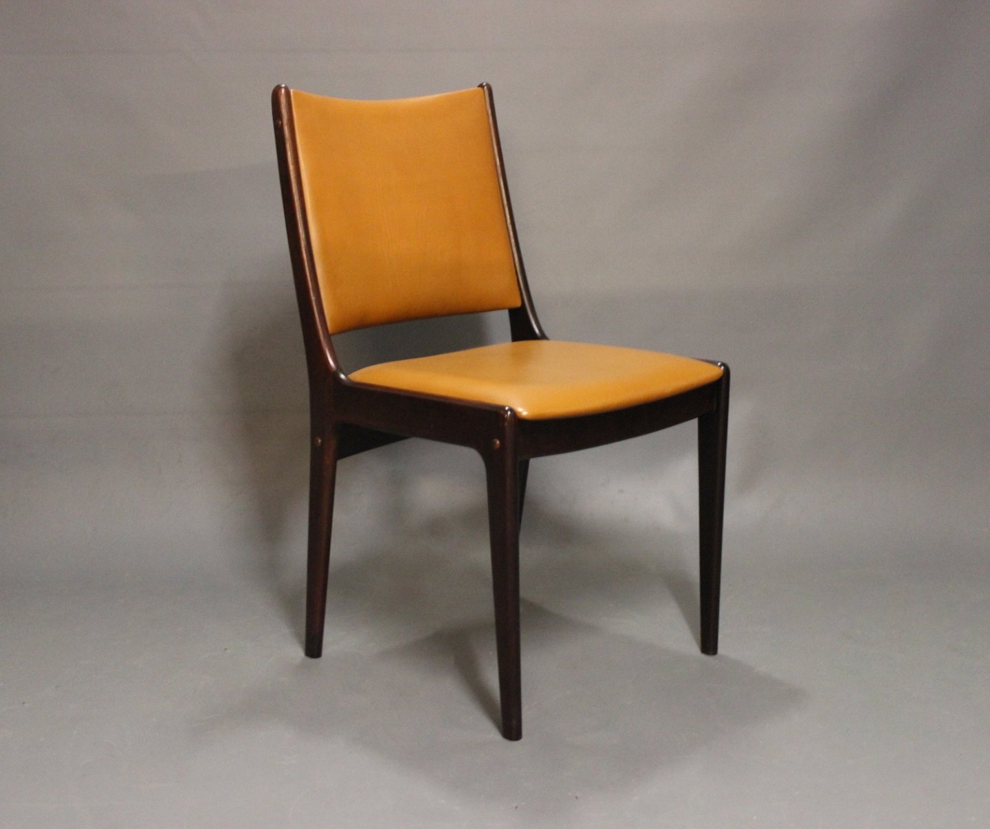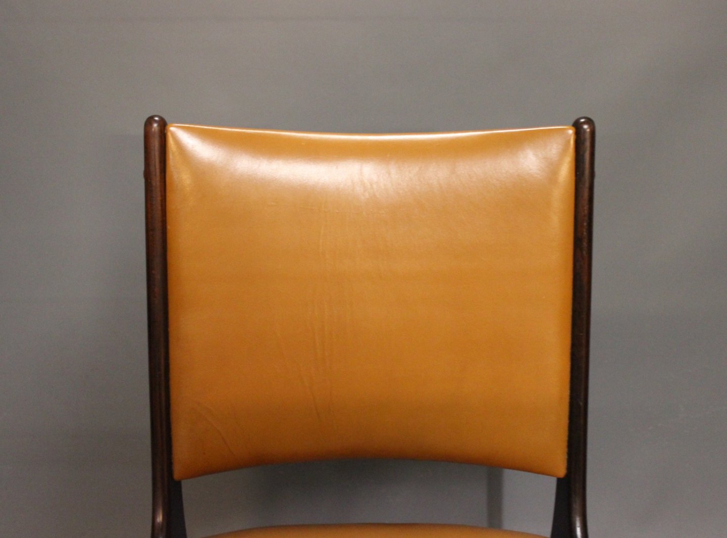 Beskrivelse: Et sæt af 4 spisestuestole i poleret mahogni og cognac farvet læder. Stolene er af dansk design fra 1960erne.