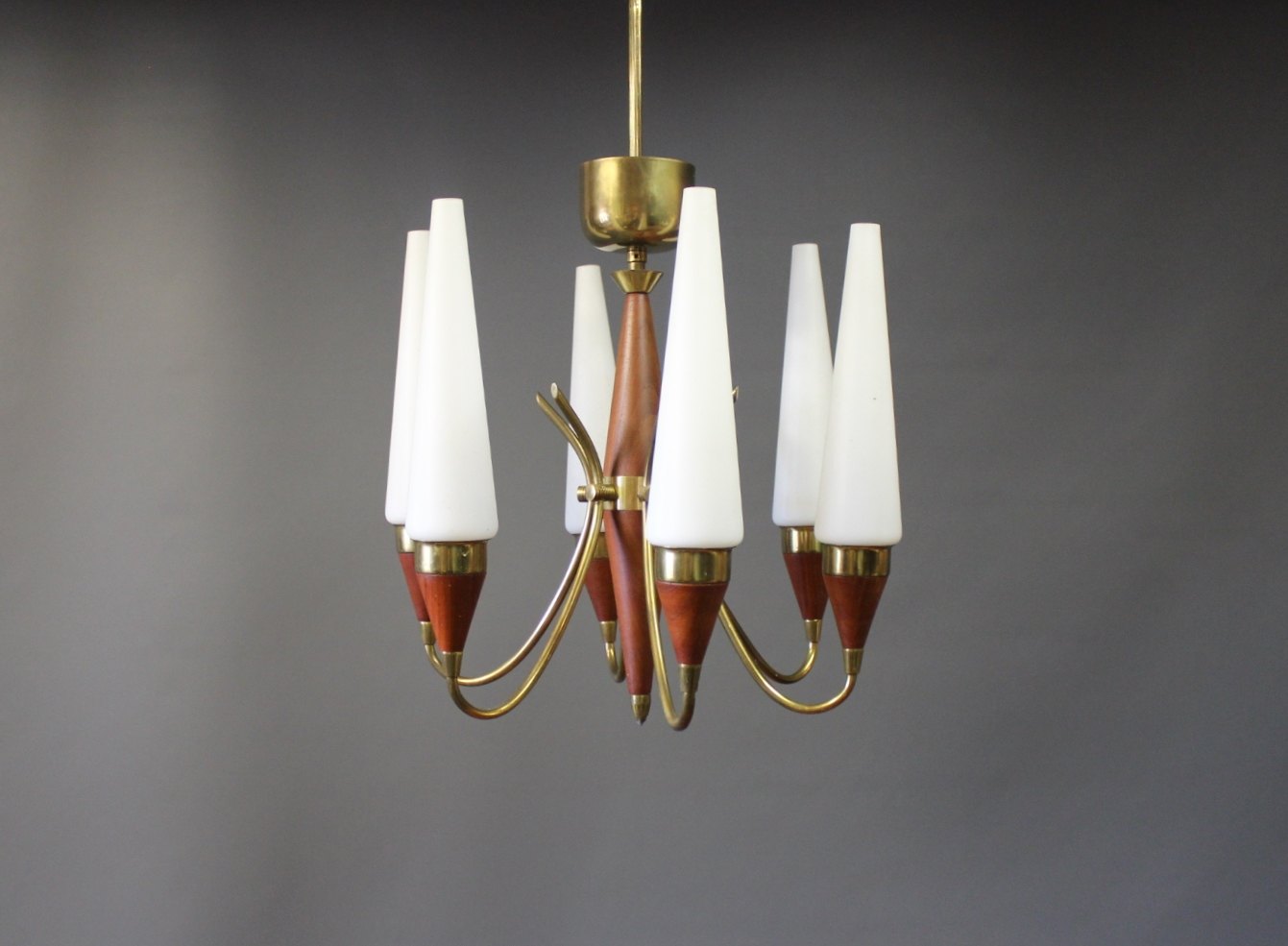 Lysekrone i teak og messing af Bent Karlby for LYFA fra 1960erne.