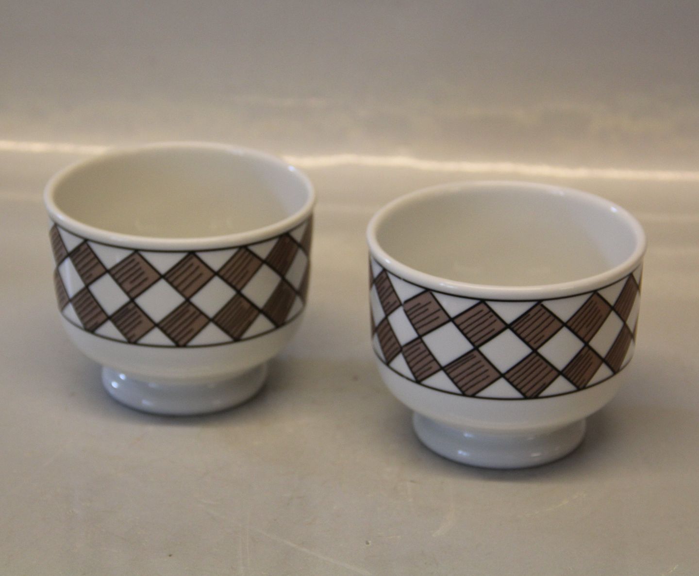 Description: B&G 570.2 Pair of Bowls 7.5 x 9.5 cm Brown squarres - harlequin Bing and Grondahl Marked with the three Royal Towers of Copenhagen. Bing & Groendahl In mint and nice condition