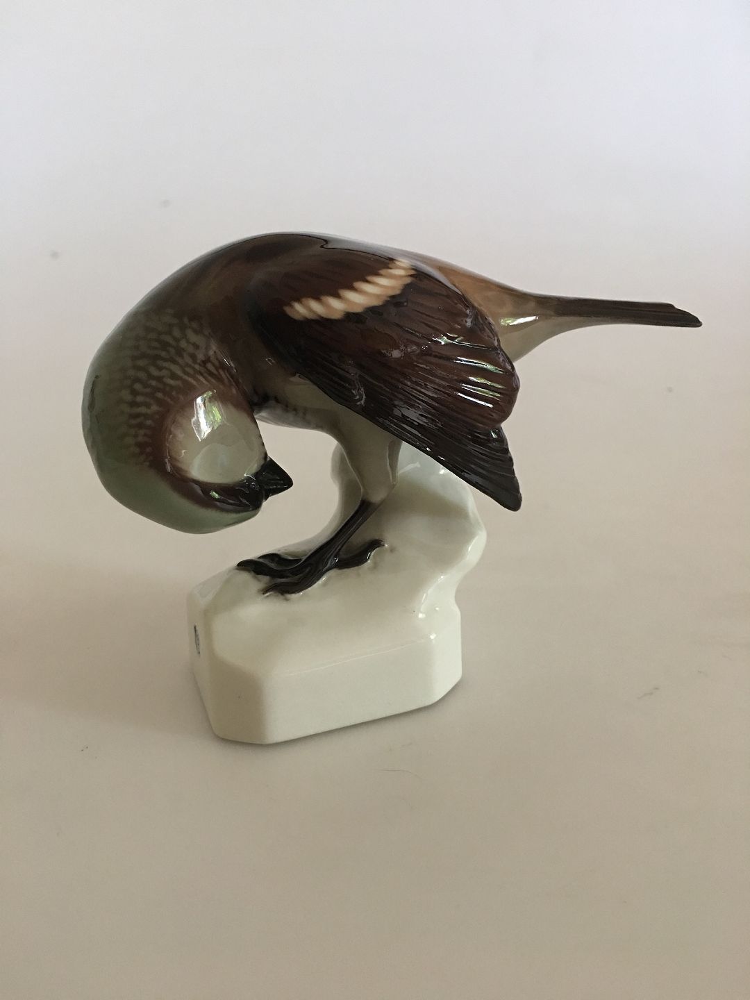 Description: Nymphenburg Neuhauser Figurine of Sparrow No. 446. 8.5 cm H (3 11/32"). In good condition, with the exception of a tiny dent on the talefeather.