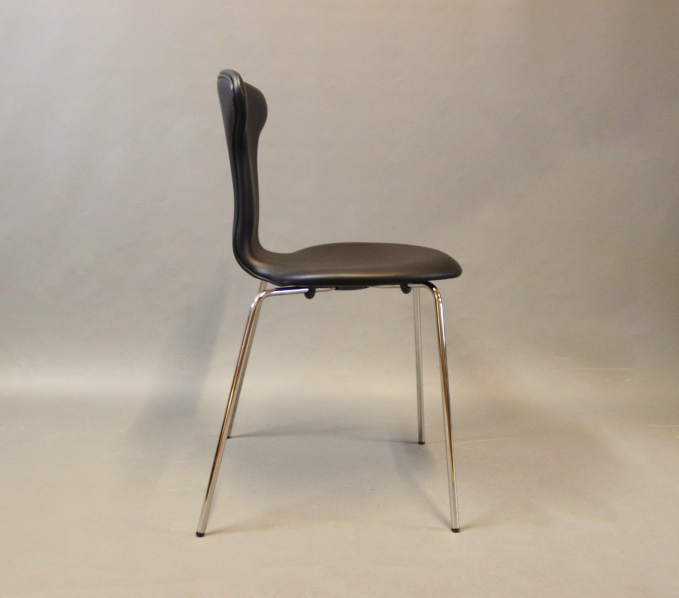 Beskrivelse: Et sæt af 6 Munkegaard stole i nypolstret sort savanne læder designet af Arne Jacobsen i 1955-1957 og fremstillet af HOWE.