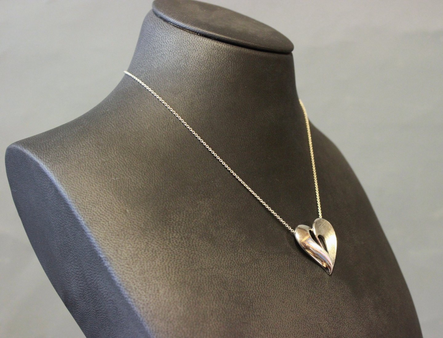 : Vedhæng i form af et hjerte i sølv og stemplet SJ.