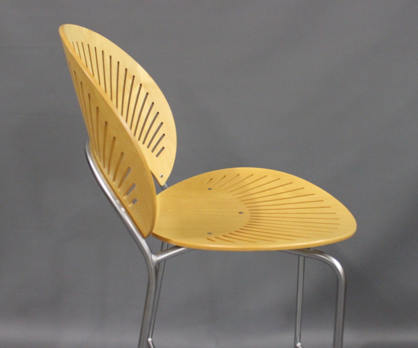 Beskrivelse: Et par Trinidad bar stole i Birk og med stel af krom. Stolene er designet af Nanna Ditzel i 1998 og fremstillet af Fredericia Møbelfabrik. Model nr.: 3300 og serienr.: 1002.