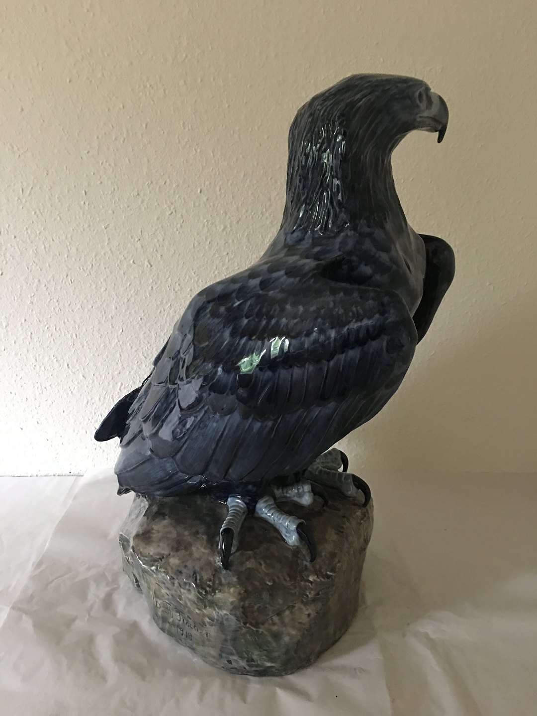 Beskrivelse: Royal Copenhagen Blå Ørn Vilhelm Th. Fischer 1857-1928. Figur af porcelæn i form af ørn siddende på klippestykke. Fremstillet hos Royal Copenhagen, dessin 123. Sign. Vilhelm Th. Fischer 1919. H. 54 cm. Mærket som 1st sortering og i perfect stand.