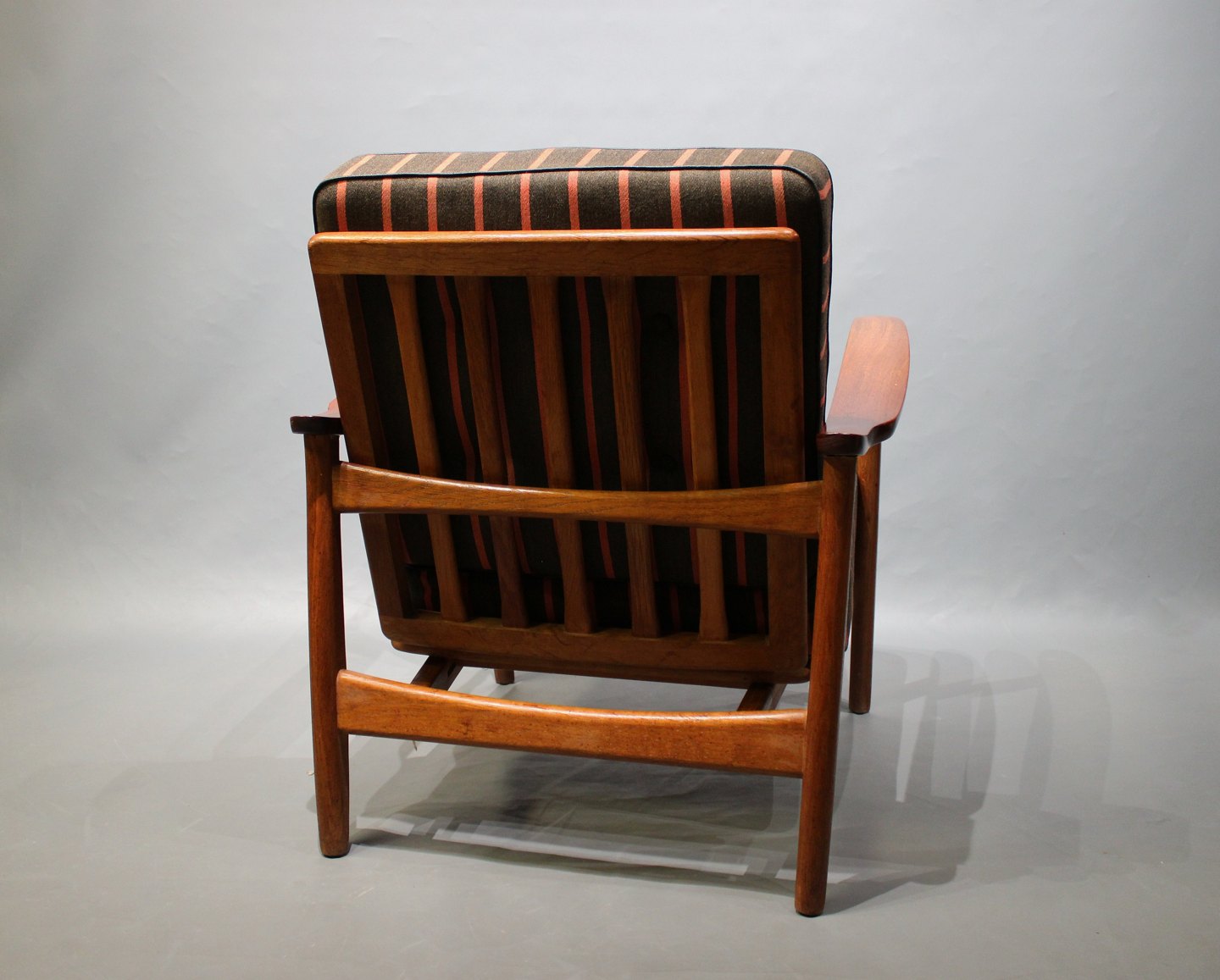 Beskrivelse: Et par hvilestole i teak og mørke gråt uld betræk med røde striber. Stolene er af dansk design fra 1960erne og er i flot brugt stand.