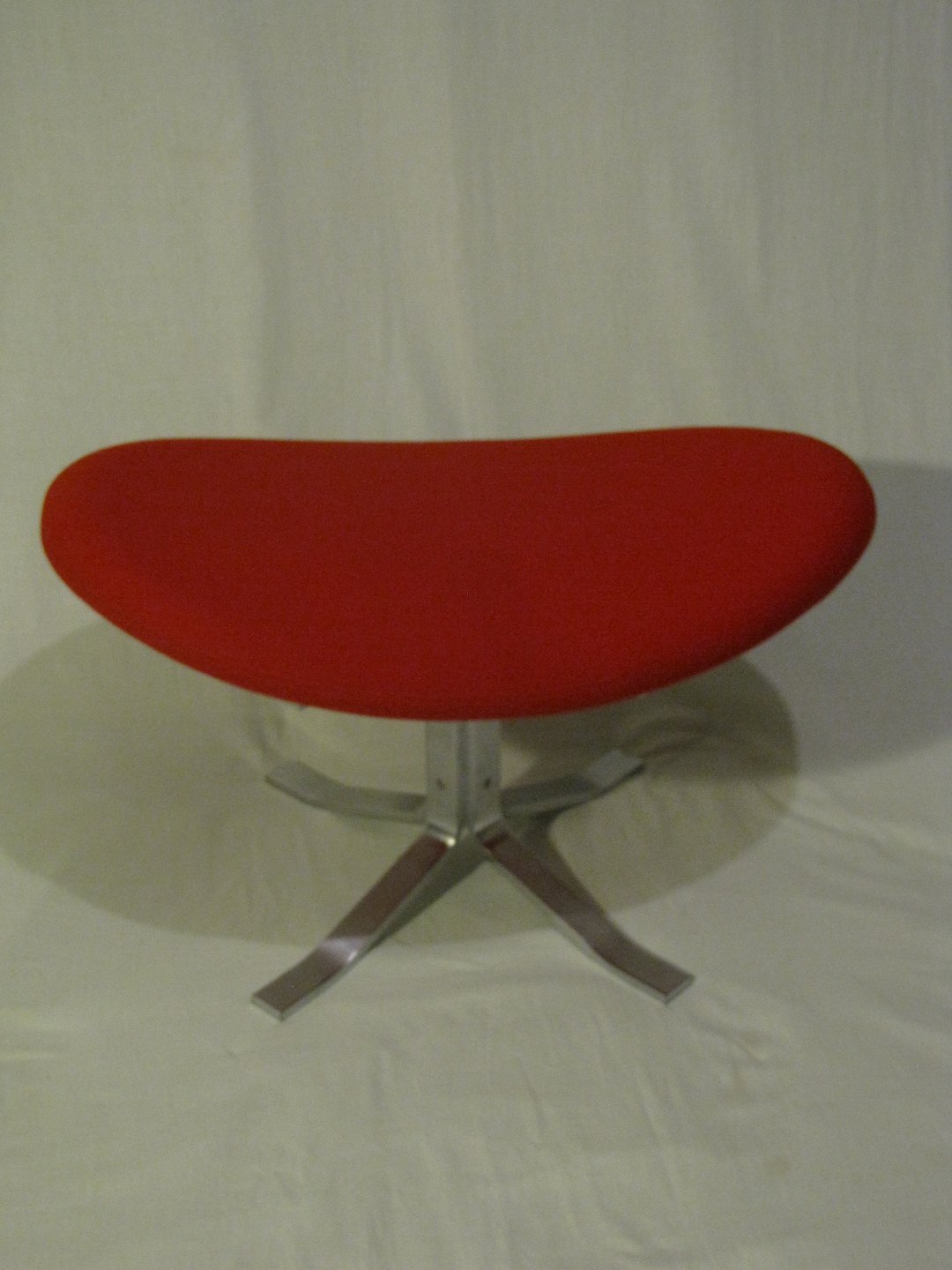 Description: Poul M. Volther. Corona lounge chair and footstool. Model EJ5, Brushed steel covered with red Hallingdal wool from Kvadrat. Designed by Poul M. Volther in 1964. Produced by Erik Jørgensen furniture factory. Good condition.