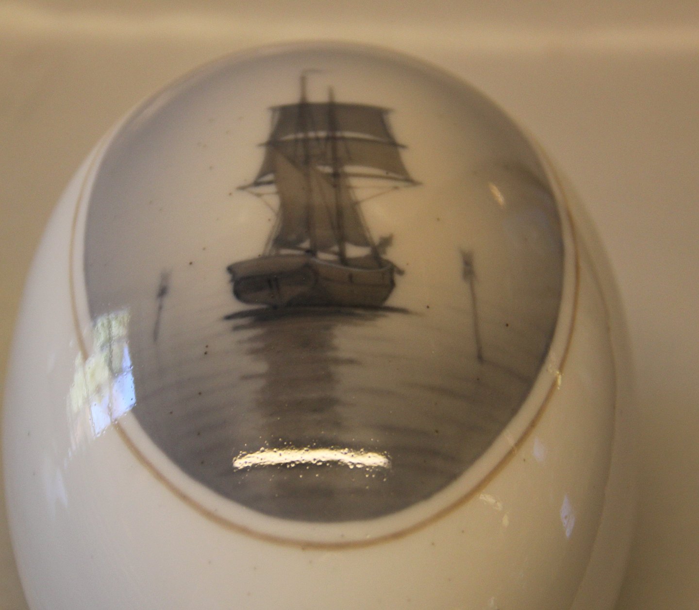 Beskrivelse: 2040-1095 Kgl. Art nouveau æggeformet lågskål 16 x 11 x 11.5 cm Marine motiv fra Royal Copenhagen I hel og fin stand Sejlskib i Øresund
