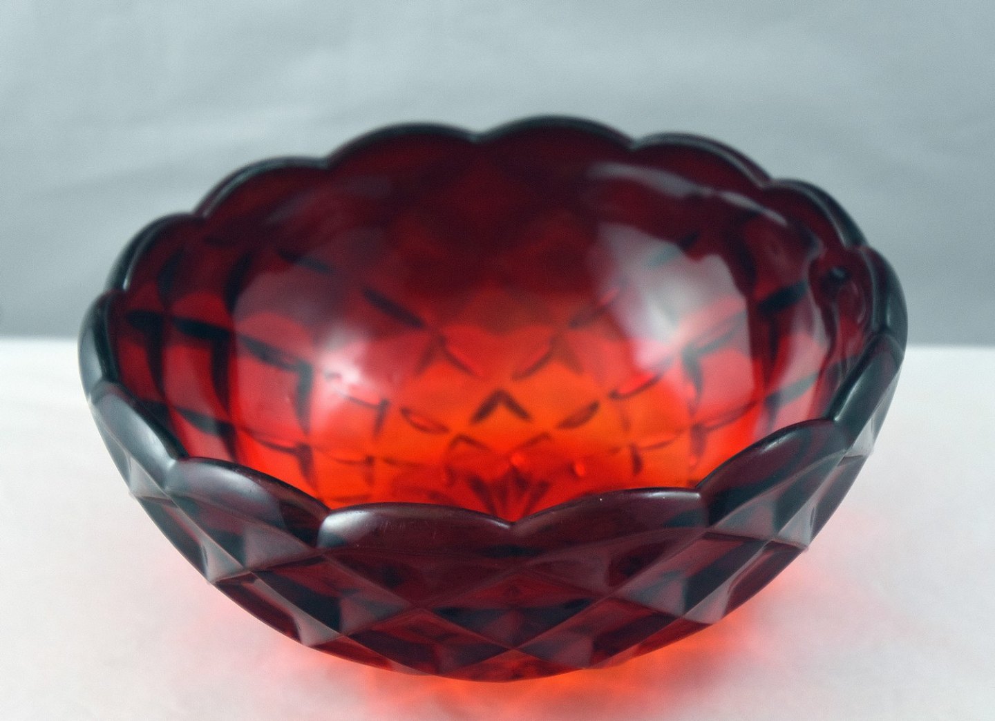 Beskrivelse: Fyens Glasværk, rød jordbærskål med bølgekant og af presset glas Odin, fra 1924. Skålen har en anelse slid indvendig i bund