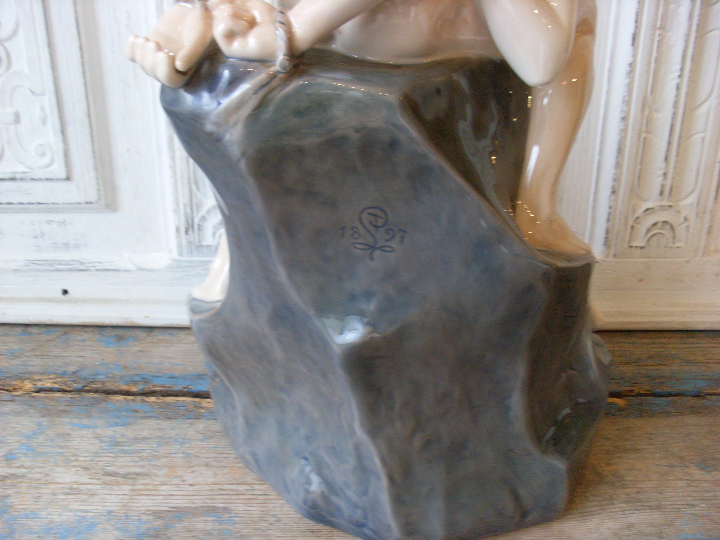 Mærket med to ridser i selve porcelænet - grundet brændings revne under pigens knæ.