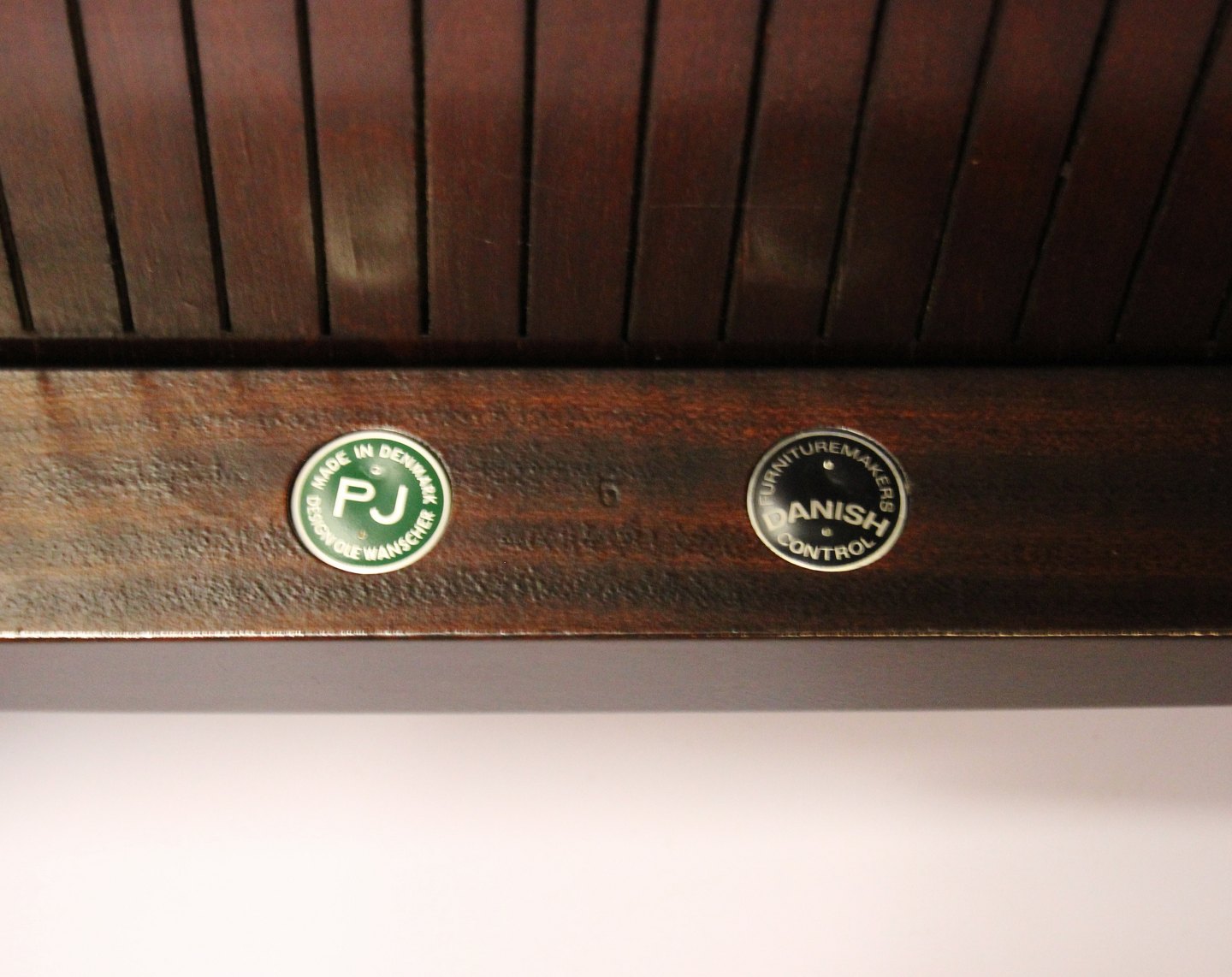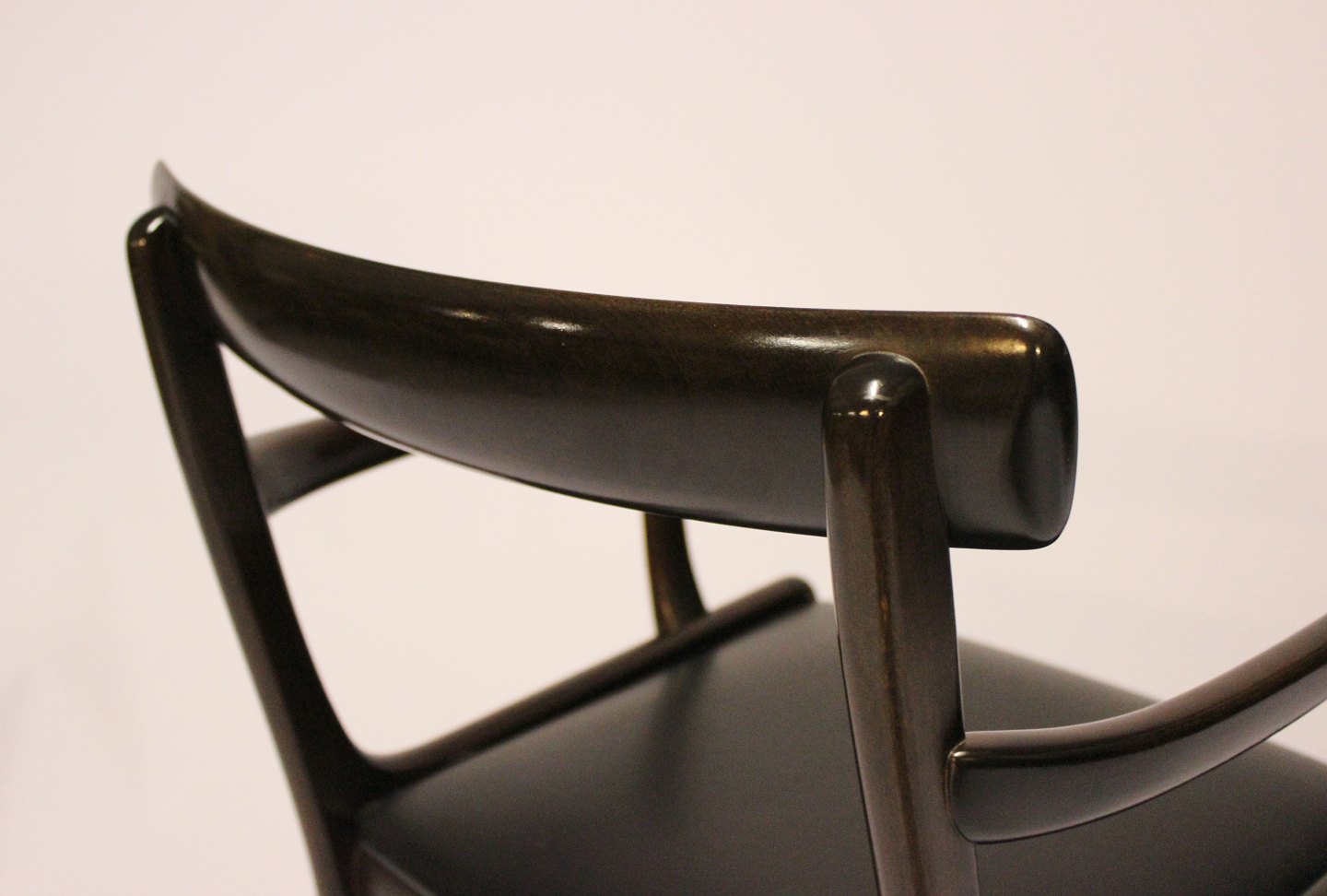 Et par "Rungstedlund" armstole i mahogni og sort læder, af Ole Wanscher og produceret af P. Jeppesen.
