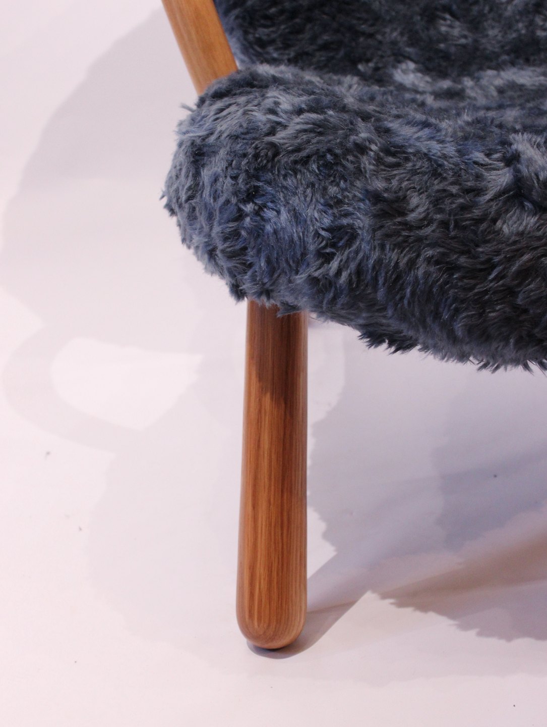 Description: "The Clam Chair" originally designed by Phillip Arctander in 1944 and manufactured by Paustian in 2016. The chair is upholstered in dark blue sheep skin and with amrs and legs og oak.