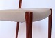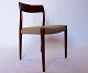 Description: Set of 6 dining chairs, model 77, in teak and light grey leather designed by N.O. Møller and manufactured by J.L. Møller furniture factory in the 1960s.