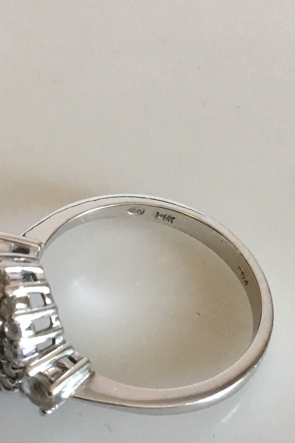 Beskrivelse: Ring i 14 K Hvidguld med Blå sten(Safir) to Brillanter omkranset af 16 små sten. Ringstørrelse 54. Vejer 3,48 gram. Stemplet 585