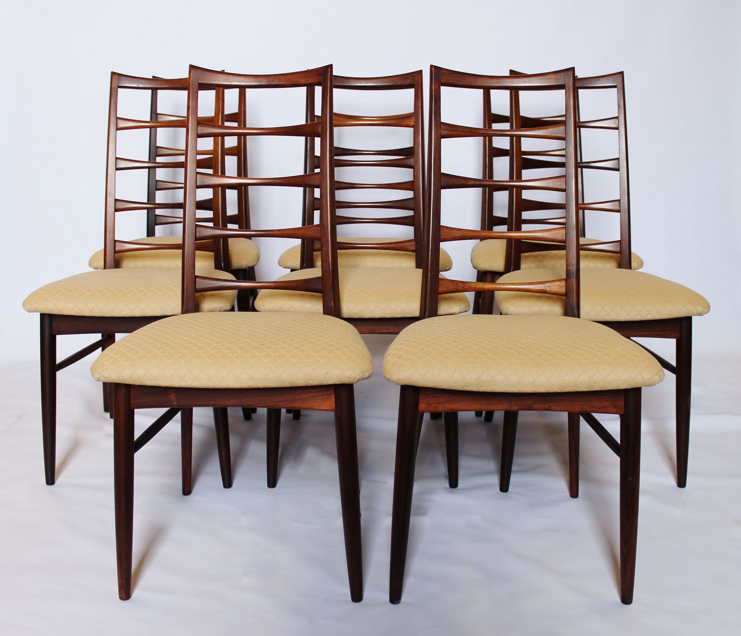 Beskrivelse: Sæt af 8 spisestuestole, model Lis, i palisander designet af Niels Koefoed i 1961 og fremstillet af Koefoed Møbelfabrik, Hornslet i 1960erne.