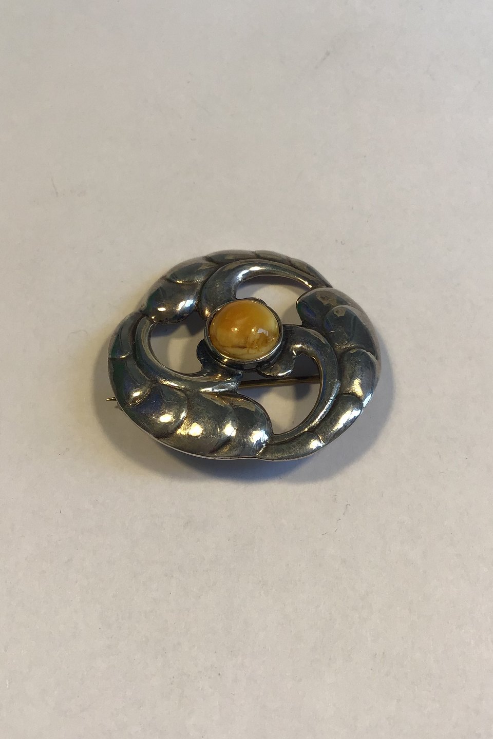 Beskrivelse: Broche sterling sølv med rav center i blad-ornamentik, 12,4 gr. Stemplet PE for Peter Ernst, Skagen
