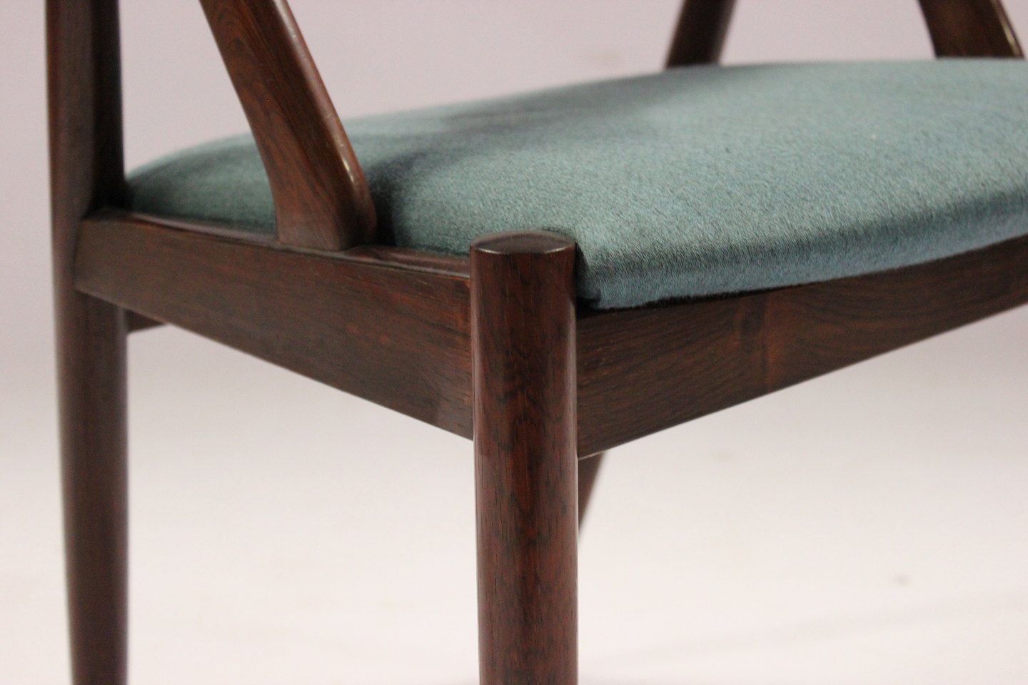 Beskrivelse: Et sæt af fire spisestuestole, model 31, designet af Kai Kristiansen i 1956 og fremstillet hos Schou Andersen i 1960erne. Stolene er i palisander og polstret med turkis stof.