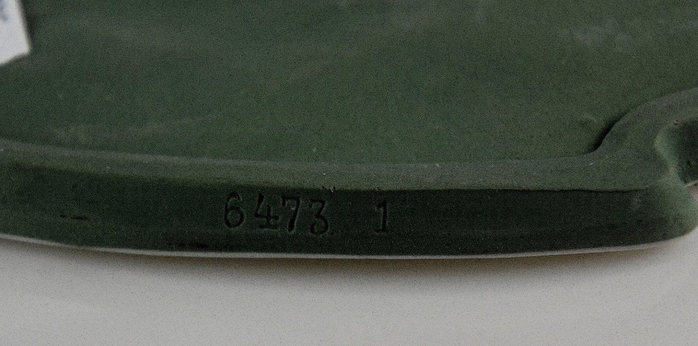 Beskrivelse: Biskuit platte/relief, fremstillet af Wedgwood jasperware, som er uglasseret porcelæn også kaldet biskuit, grønt med hvidt motiv