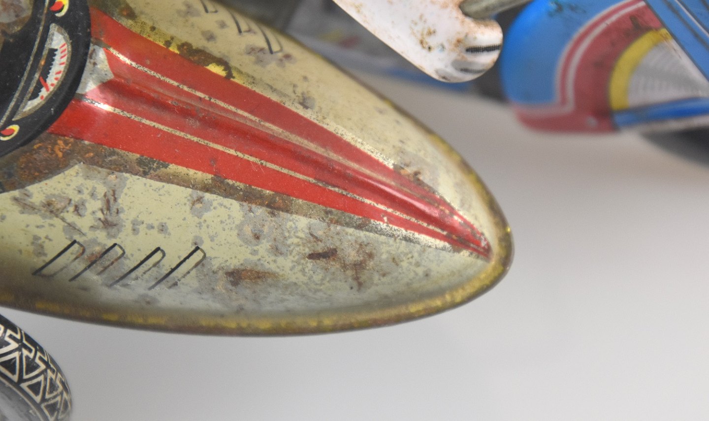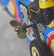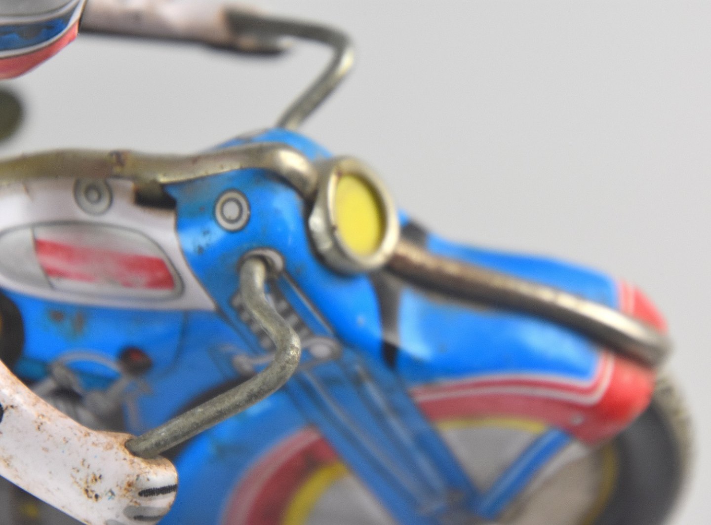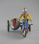 Beskrivelse: Mekanisk blik motorcykel med sidevogn. Motorcyklen er lavet i blik og skal trækkes op for at kører. Der er forskellige brugsspor på motorcyklen