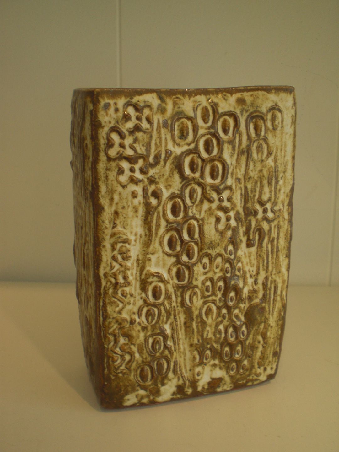 Beskrivelse: Jørgen Mogensen (1927 - ) firkantet stentøjsvase fra eget værksted (1965 - 2000) - Brun/beige glasur med presmønstre og riller. Signeret jm, Danmark F209. Mål: 19 x 11,5 x 8,3 cm. I perfekt stand.