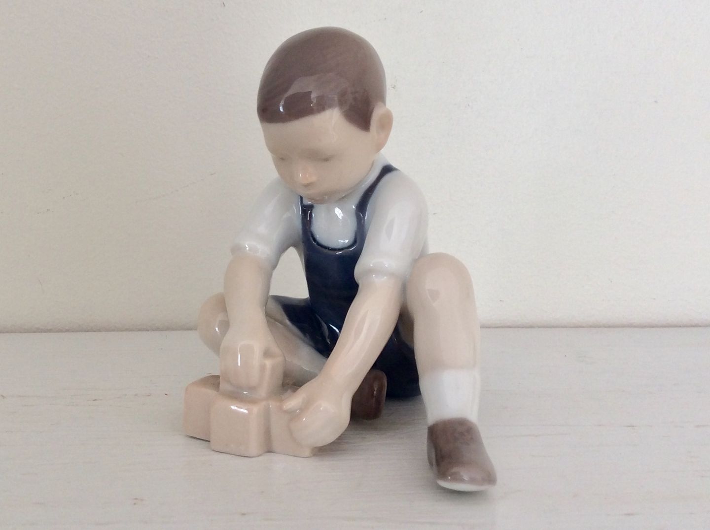 Beskrivelse: Bing og Grøndahl, Dreng med klodser #2306, 11cm høj, 10cm bred, Design Svend Jacobsen, 1.Sortering *Perfekt stand*