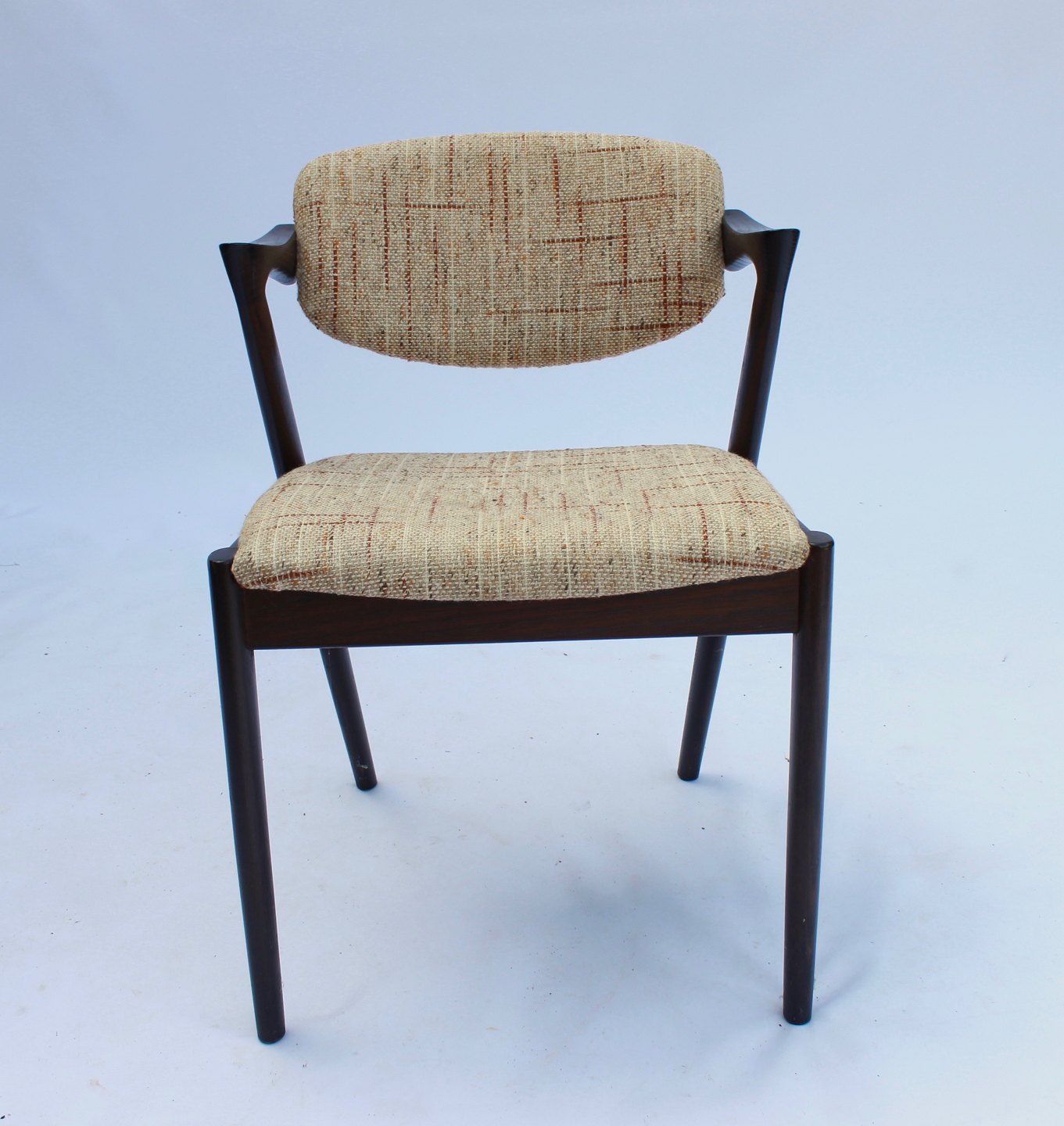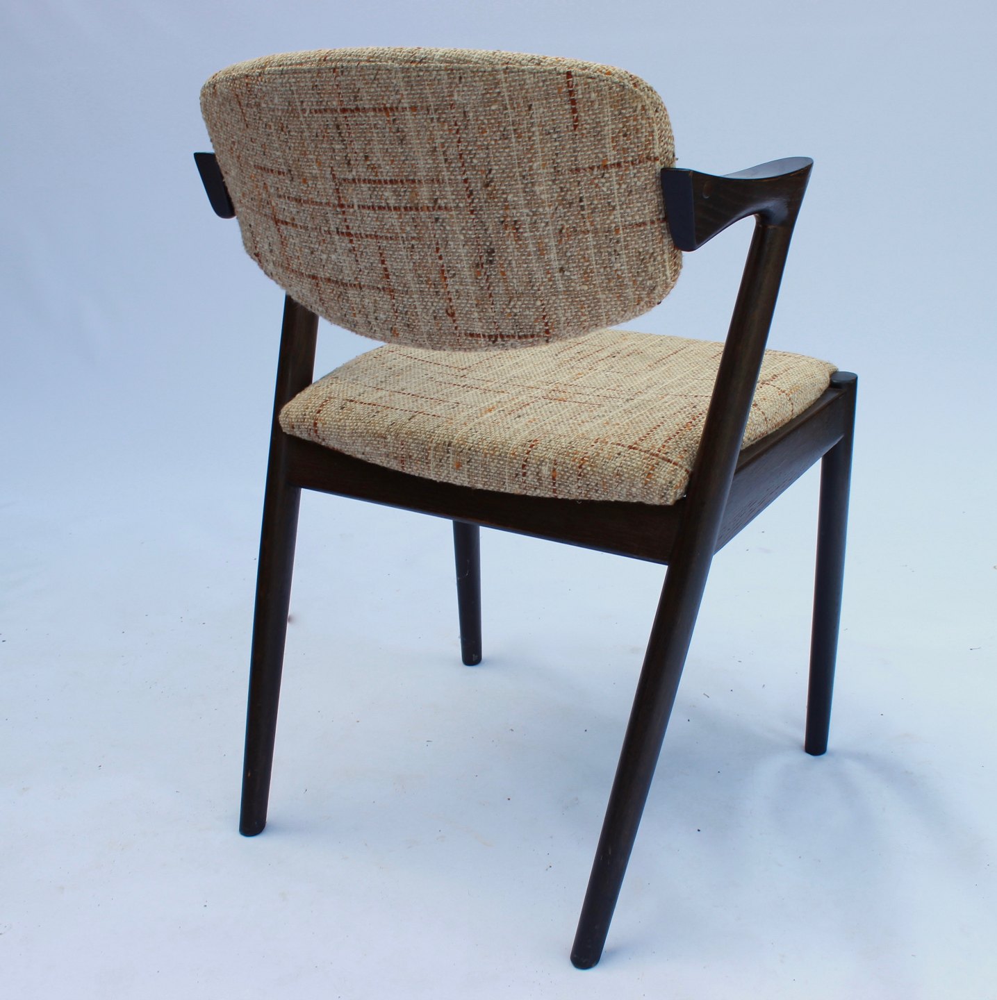 Beskrivelse: En spisestuestol, model 42, designet af Kai Kristiansen og fremstillet hos Schou Andersen i 1960erne. Stolen er af mørk eg og polstret i lyst uldstof.