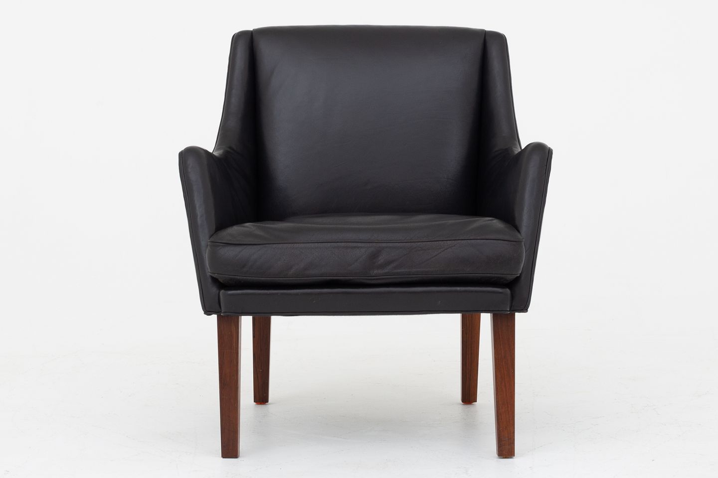 Lænestol i patineret sort læder med ben i palisander.