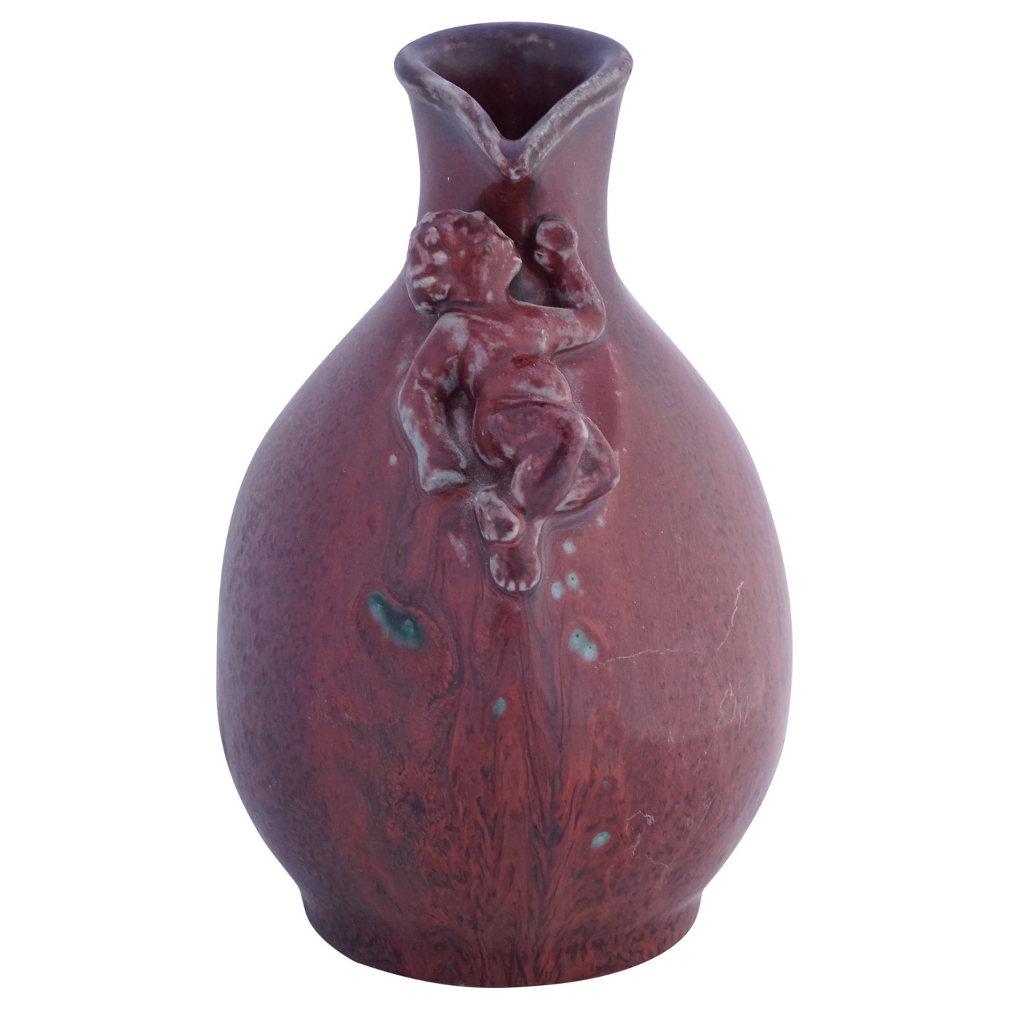 Bode Willumsen for Royal Copenhagen; En kande af stentøj, modelleret med puti i relief. Dekoreret med okseblods glasur.