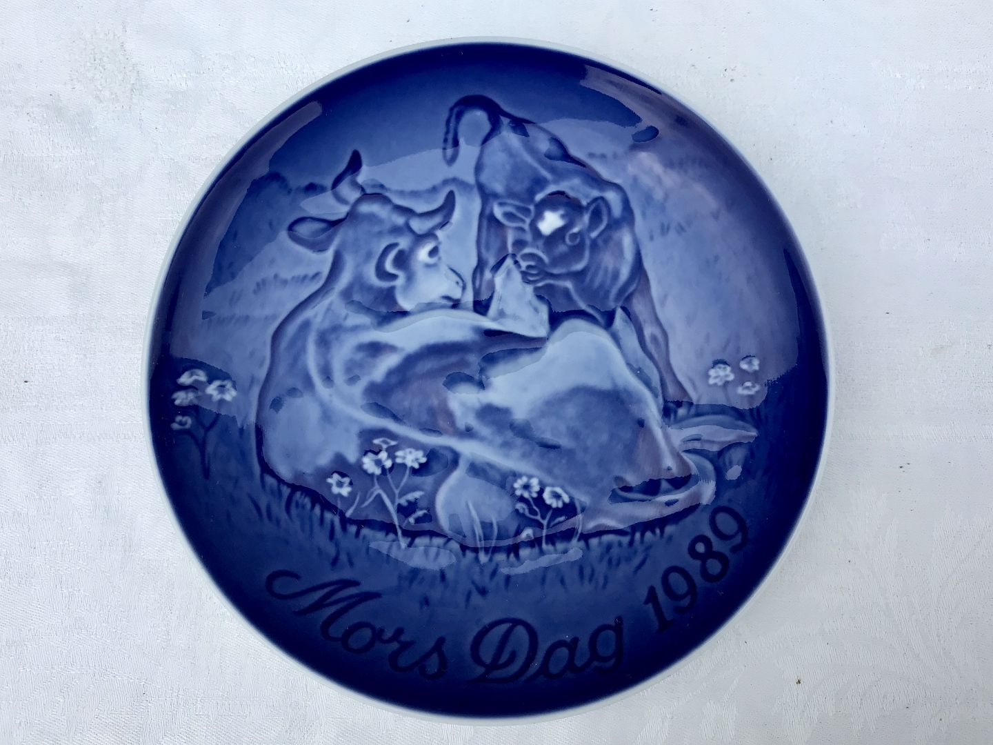 Beskrivelse: Bing & Grøndahl, Mors dag Platte, 1989, Ko med kalv, 18cm diameter, Design Henry Thelander *Pæn stand*
