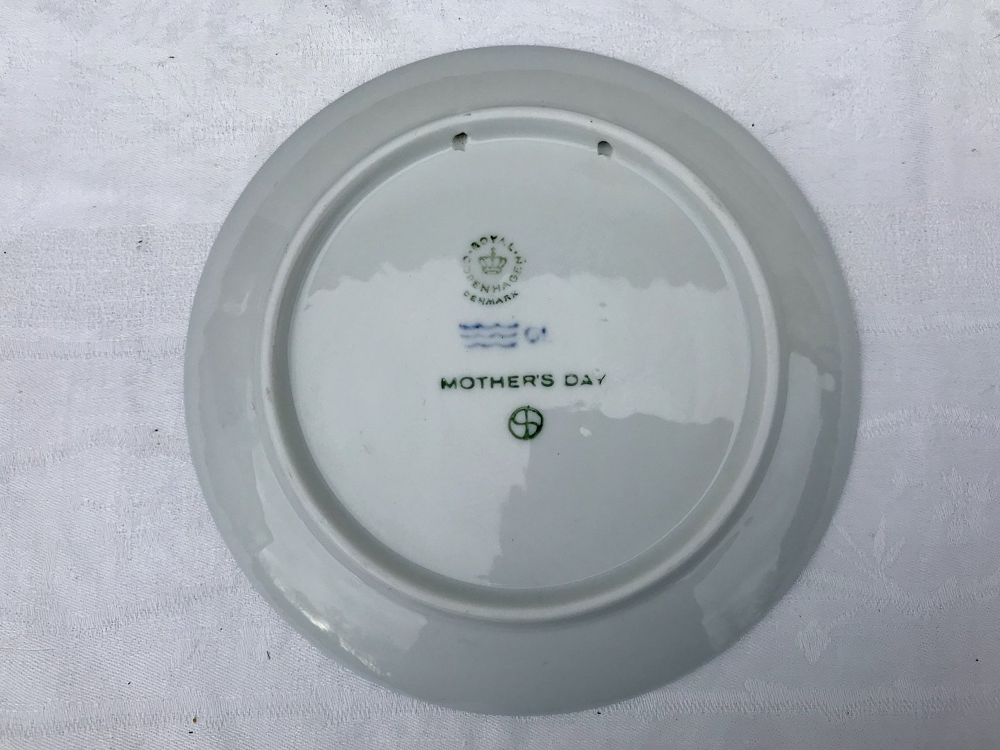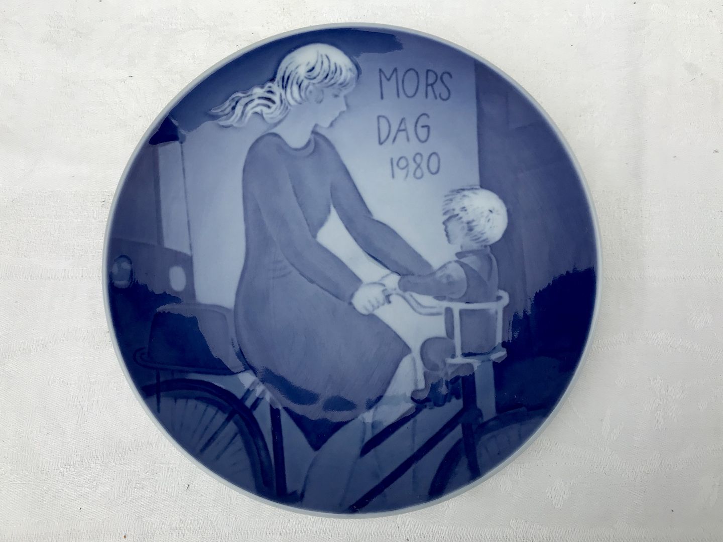 Beskrivelse: Royal Copenhagen, Mors dag platte, 1980, Mor på cykel med barn, 18cm i diameter, Design Ib Spang Olsen *Perfekt stand*