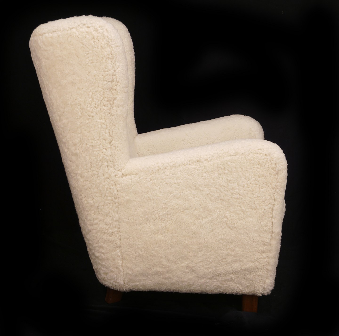Dansk møbelproducent: Højrygget hvilestol nybetrukket med lammeuld. Danmark ca. år 1935. H: 105cm. B: 81cm