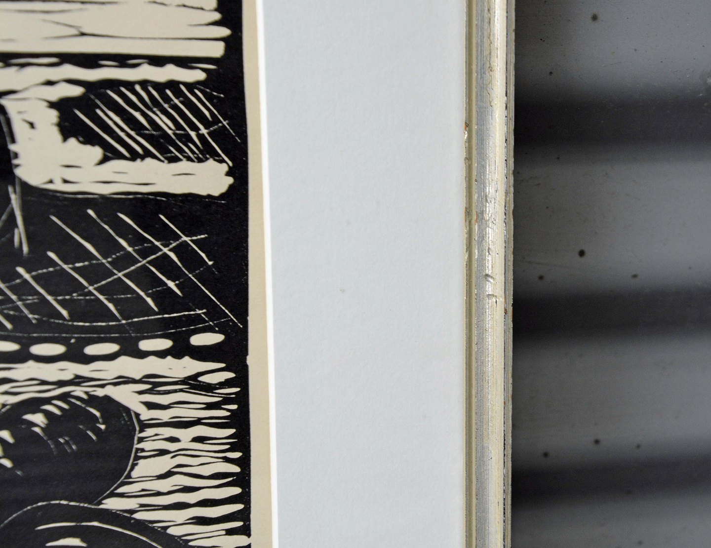 Beskrivelse: Indrammet træsnit i sølvmale ramme med motiv af redningskrans og bøje