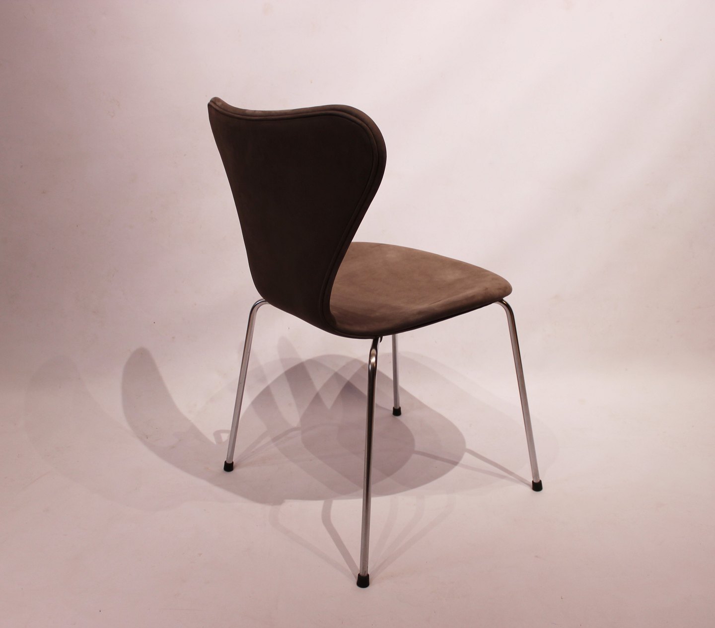 Beskrivelse: Et sæt af 6 Syver stole, model 3107, designet af Arne Jacobsen og fremstillet hos Fritz Hansen i 1967. Stolene er originalt polstret i lysebrunt nubuck læder.